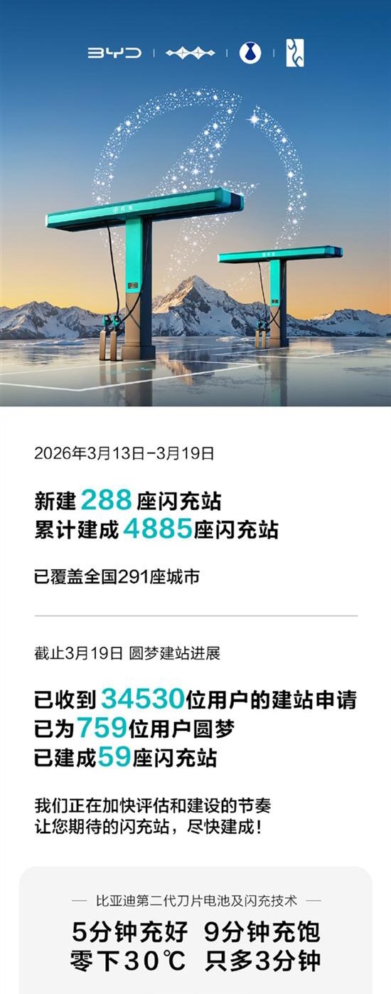 3月13日至19日一周时间内,比亚迪新建288座闪充站,目前全国累计建成闪充站达4885座,已实现全国291座城市的覆盖。