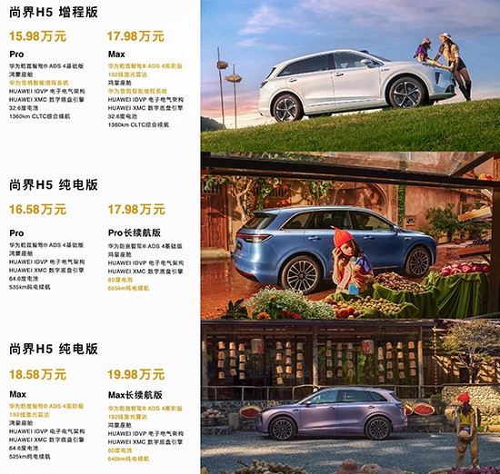 2025年9月19日,尚界H5正式上市,新车共推出X款配置,售价区间为15.98-19.98万元。尚界H5是鸿蒙智行“第五界”——尚界旗下的首款车型,定位为中型SUV,动力方面提供纯电动和增程式两种选择。