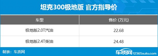 12月11日,坦克300极地版正式上市,新车共推出2款车型,官方指导价22.68-24.48万元,并限量发售300台。同时,官方还限时推出荣耀启程礼、心想事橙礼等多项购车权益。